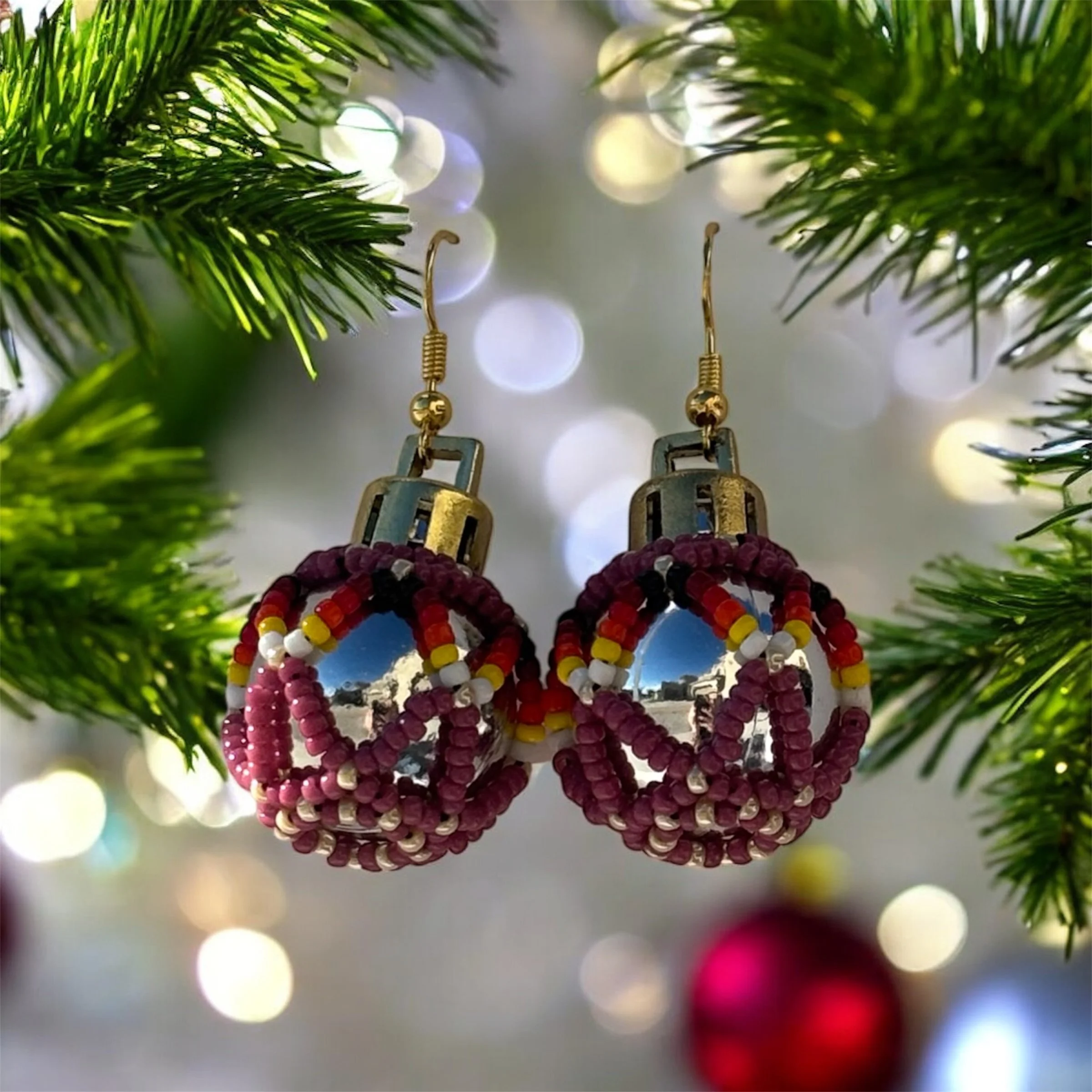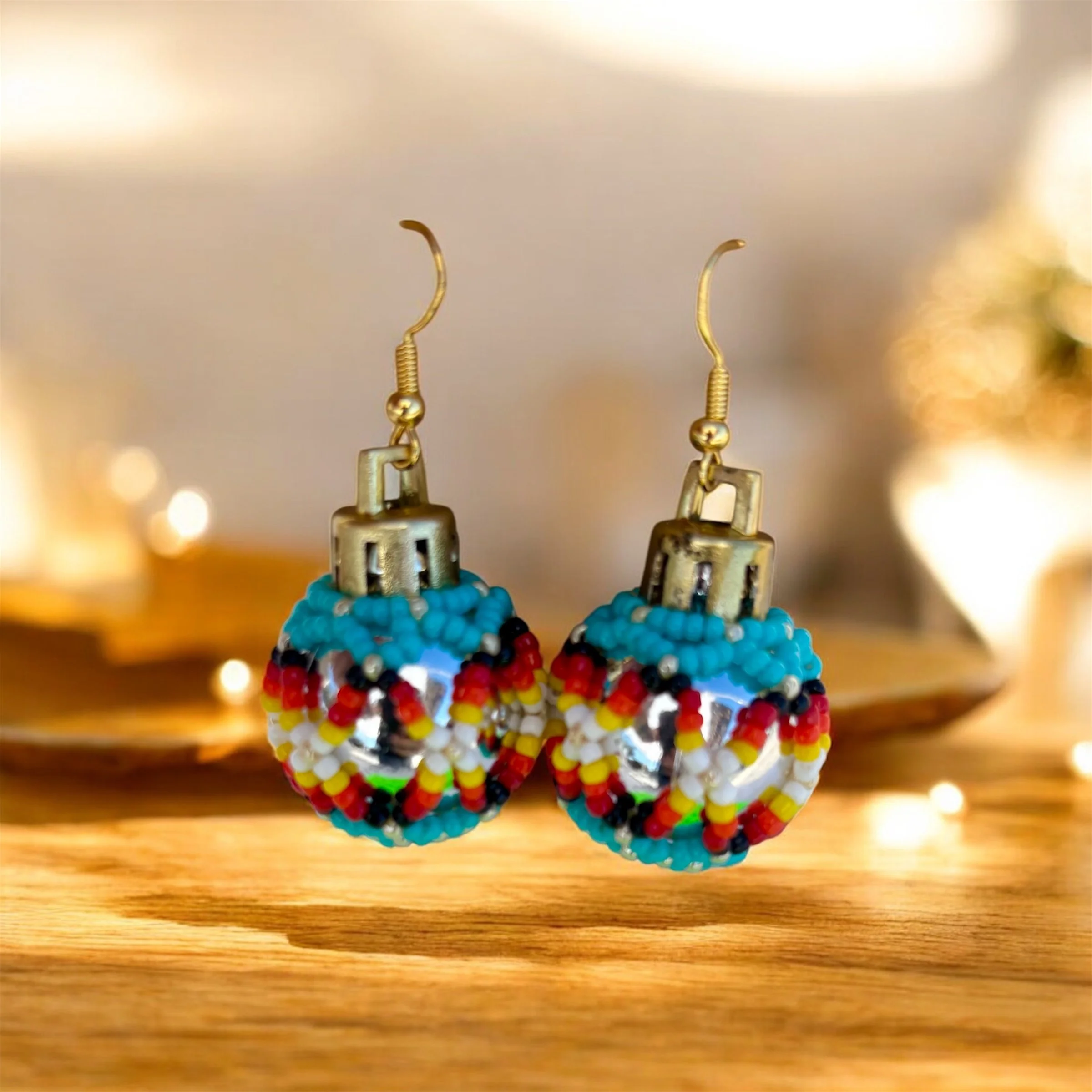 These beaded ornament earrings bring a festive pop of color and sparkle. Designed to resemble classic holiday ornaments, each piece features rich red beadwork accented with gold details, creating a warm, glowing finish that catches the light beautifully.